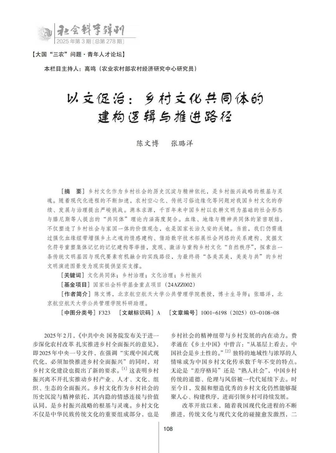 我院教授陳文博、科研助理張璐洋在《社會科學輯刊》發表文章:以文促治:鄉村文化共同體的建構邏輯與推進路徑